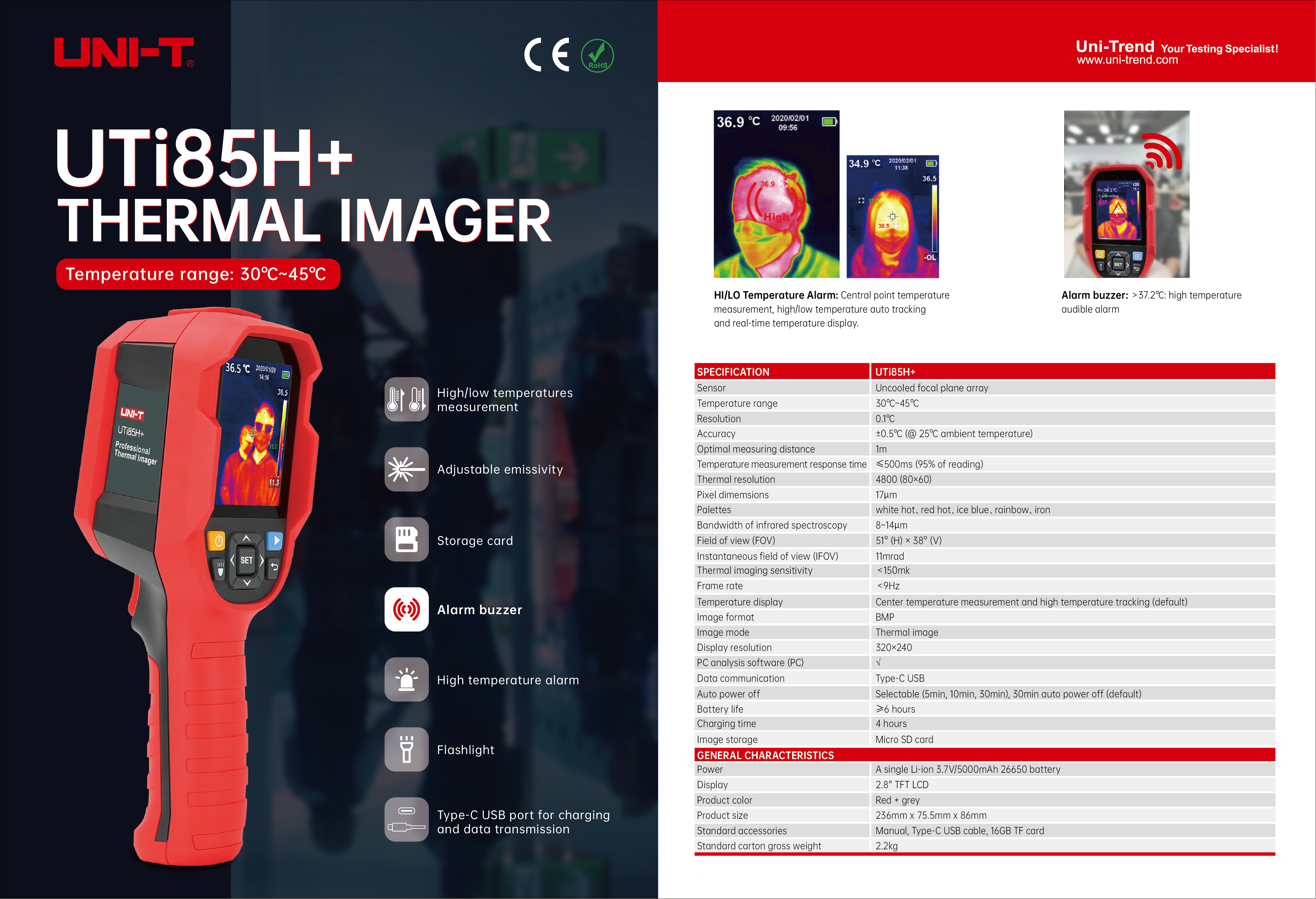 1. Medición de temperaturas altas / bajas2. emisividad ajustable3. Tarjeta de almacenamiento4. zumbador de alarma5. alarma de alta temperatura6. linterna7. Puerto USB tipo C para cargar y transmitir datos